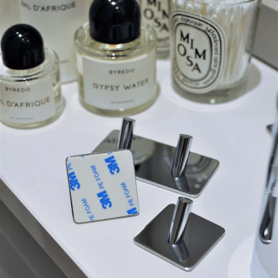 Base er en serie baderomsutstyr som er helt laget av rustfritt stål og har et selvklebende tape på baksiden som gjør montering enkel og monteres uten boring. Base 200 1-krok er tilgjengelig i fire forskjellige design; Krom, børstet rustfritt stål, matt svart og messing.