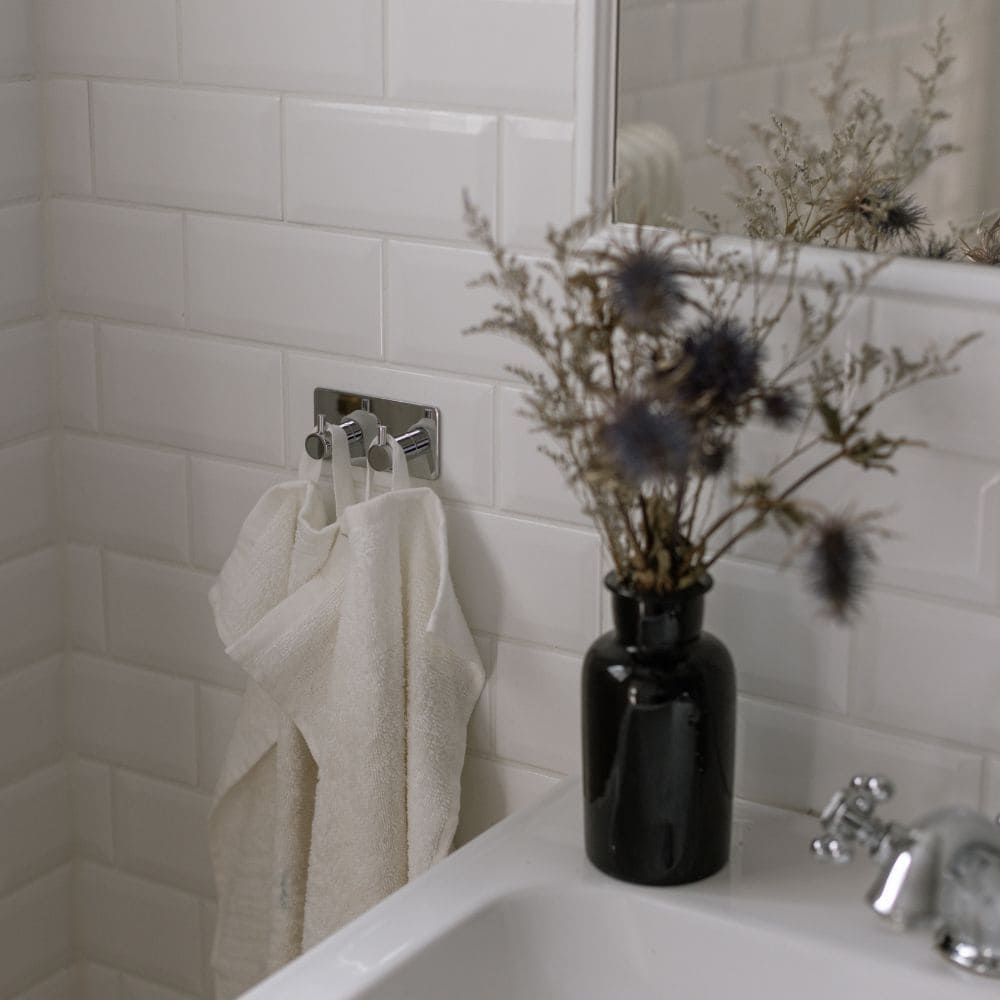 3M tape på baksiden av produktet skaper uendelige muligheter for rask endring på badet ditt, vi har interiørdetaljer som er både stilige og praktiske. Knagger til både håndkleet og badekåpen. De avrundede kantene på bakplaten skaper en myk følelse og de sirkulære detaljene ytterst på kroken skaper et stilig design, men er også praktiske ettersom håndkleet for eksempel ikke faller like lett ned når det henges opp.