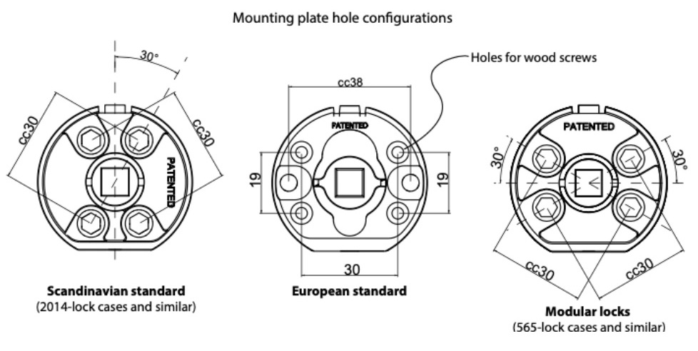 Skandinavisk standard (låskasse 2014 eller lignende) og europeisk standard passform dører som har en dørbladtykkelse på 35-48mm. Standard nøkkelplate, konverteringssett og komplett monteringssett er inkludert.