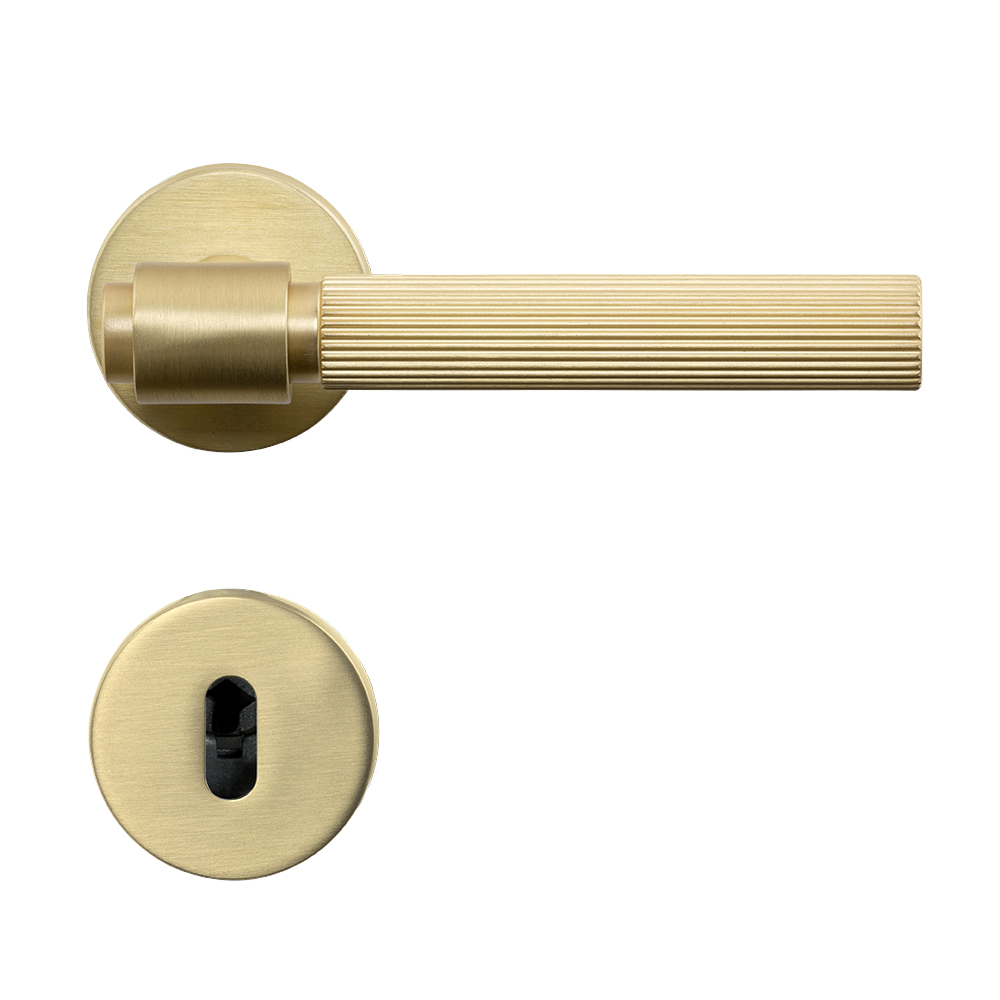 Dørhåndtak Helix Stripe i messing har en ribbet overflate med striper som skiller seg ut med en industriell design. Dørhåndtaket har en elastisk fjær, noe som betyr at håndtaket alltid går tilbake til grunnposisjonen. Perfekt for alle dører innendørs. Match gjerne dørhåndtaket med et dørstopp eller kjøkkenhåndtak i samme serie for å få en helhet i det indre av hjemmet.