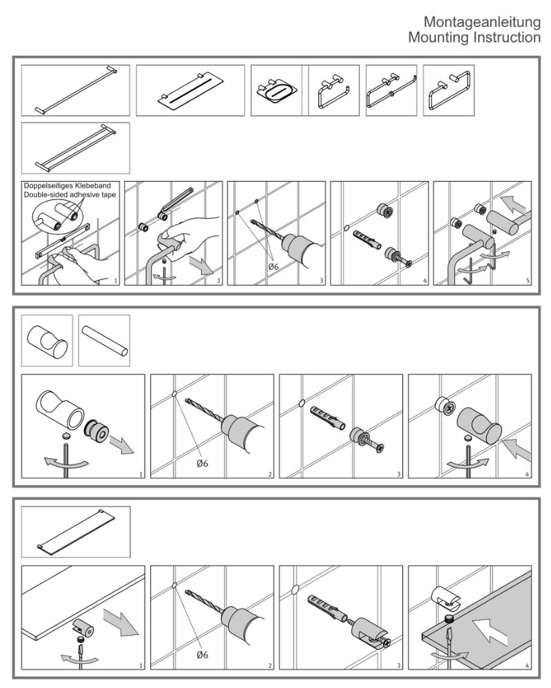 Festes på bestandige, glatte overflater som for eksempel fliser, lakkerte eller finerte platematerialer osv. Vi anbefaler ikke å montere produktene over fuger, malte vegger eller våtromstapet.